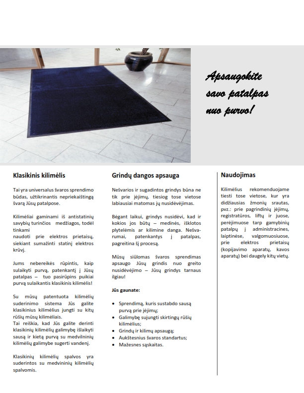 Dėl purvą sugeriančių kilimėlių užsakymo kreipkitės telefonu 8 693 72099, el. paštu info@cleanness.lt arba užpildykite užklausos formą: